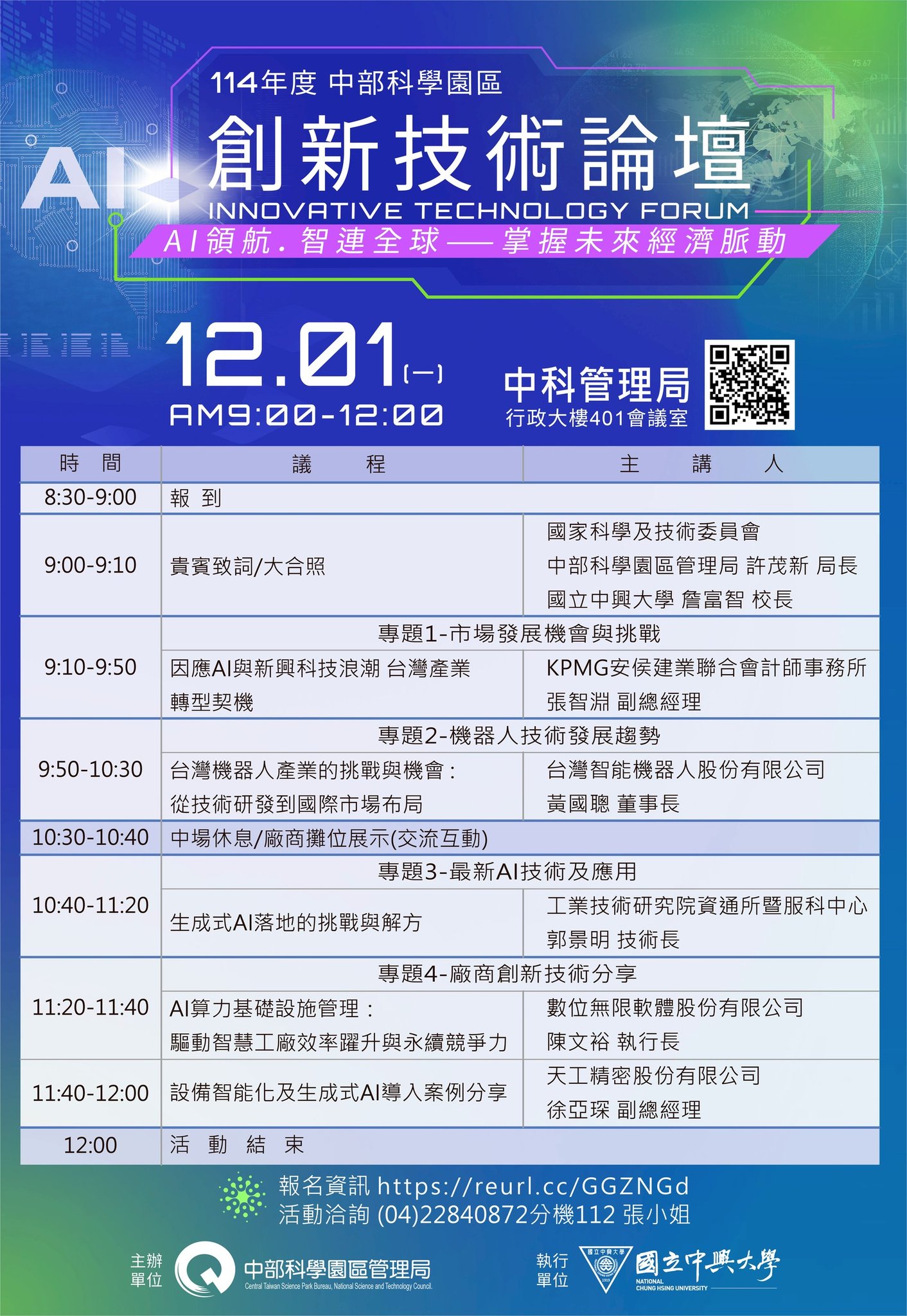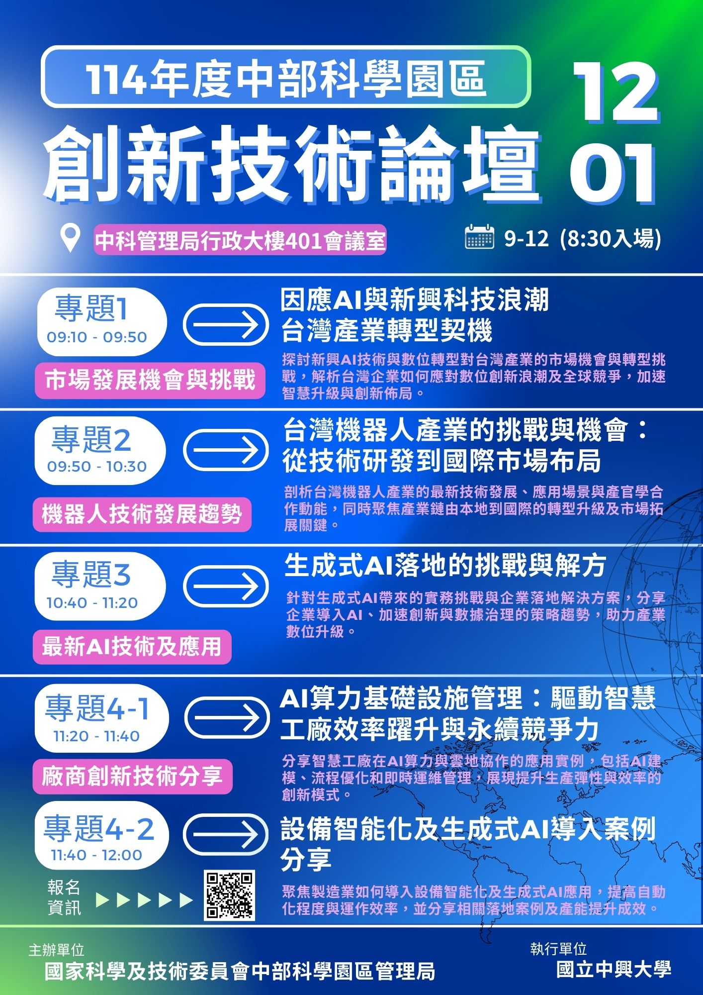 標題:【活動轉知】114年12月1日(一)09:00「中部科學園區創新技術論壇」